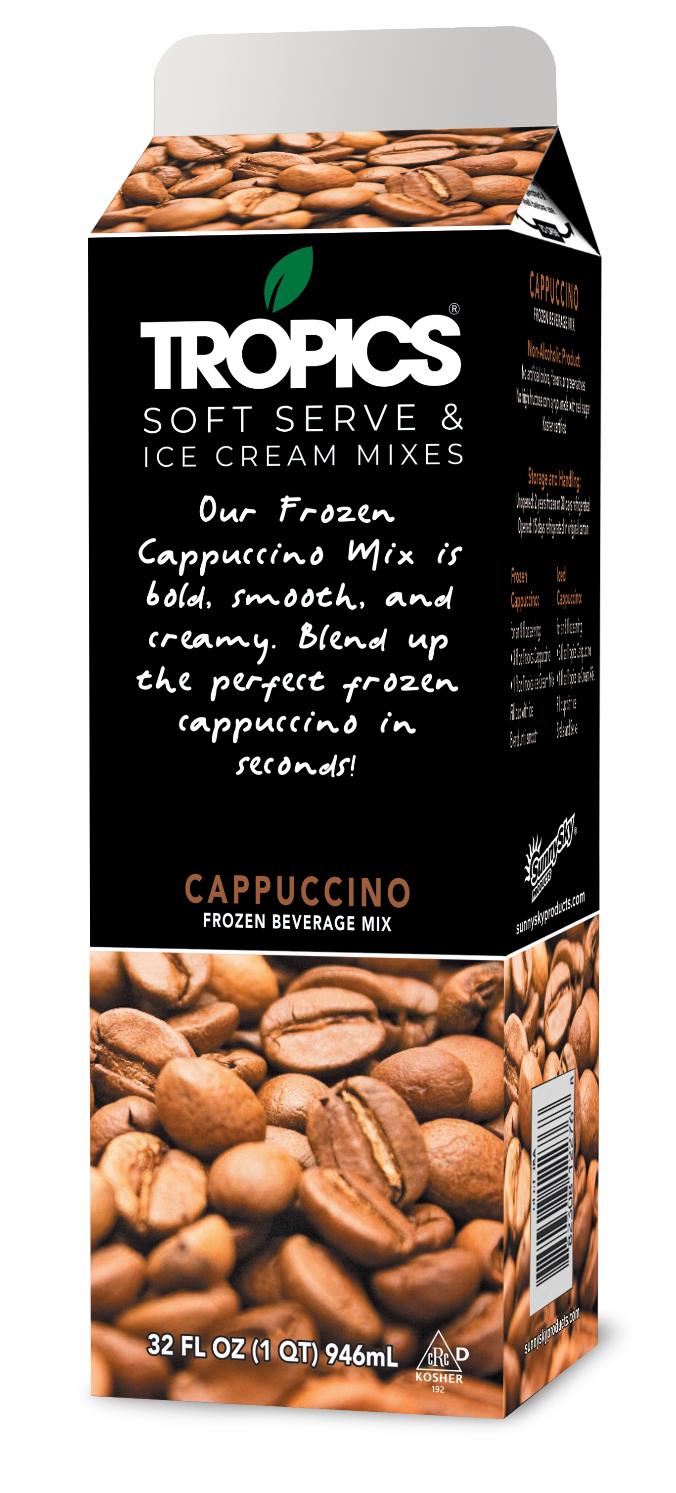 What doesn't go into our Cappuccino frozen beverage mix matters every bit as much as what does. No artificial colors or flavors. No preservatives or HFCS. Just the highest quality cream, milk, pure cane sugar, and aromatic, Arabian coffee beans sourced from the best growing regions for the highest flavor burst. That's the Tropics Mixology difference.