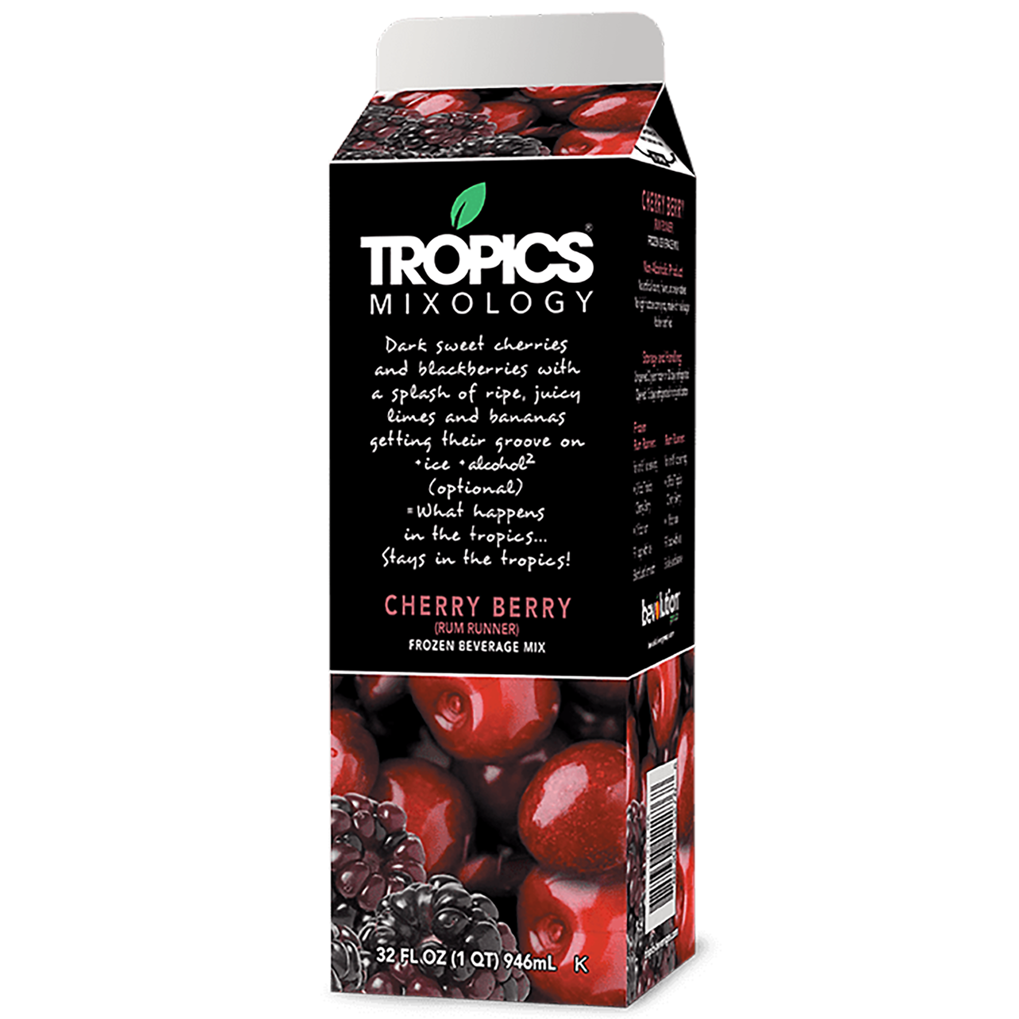 What doesn't go into our Cherry Berry (Rum Runner) frozen beverage mix matters as much as what does. No artificial colors or flavors. No preservatives or HFCS. Just all-natural ingredients like dark, sweet cherries and blackberries, luscious limes, and tropical bananas sourced from the best growing regions for the highest flavor burst. That's the Tropics Mixology difference.