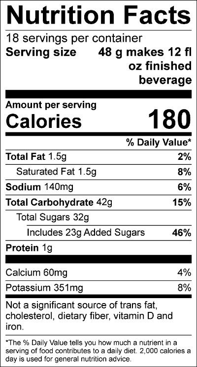 Sugar, Whey, Non-Dairy Creamer [Corn Syrup Solids, Coconut Oil, Dipotassium Phosphate, Sodium Caseinate (a milk derivative), Artificial Colors, Mono- and Diglycerides, Silicon Dioxide, Artificial Flavors], Maltodextrin, Natural and Artificial Flavors, Alkalized Cocoa Powder, Silicon Dioxide (anti-caking agent), Cellulose Gum, Coffee.