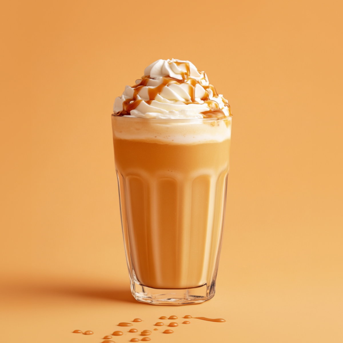 Begin with milk in blender. Add Dr. Smoothie Cafe Essentials Caramel Latte and Dr. Smoothie Cafe Essentials Vanilla Cream. Add ice. Blend until smooth and serve.