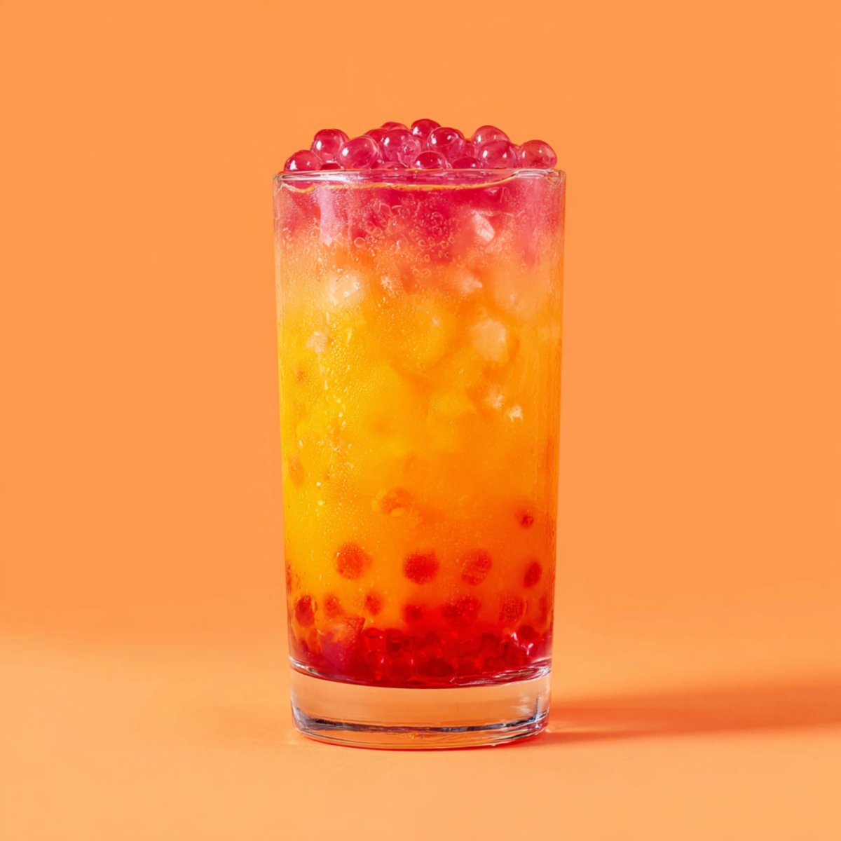 Fill a serving glass with ice. Pour in 10 oz of Dr. Smoothie Peach Mango Refresher. Add 4 pumps of UPOURIA Raspberry Syrup Add Strawberry Popping Boba